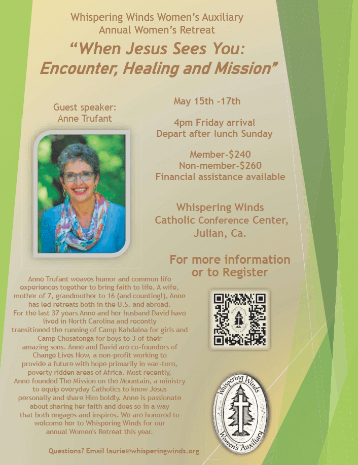 This special weekend will take place May 15th–17th, 2026 at Whispering Winds Catholic Camp in Julian, California. We will gather beginning Friday afternoon with arrival at 4:00 pm and dinner at 6:00 pm. The retreat will conclude on Sunday after lunch.